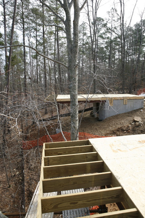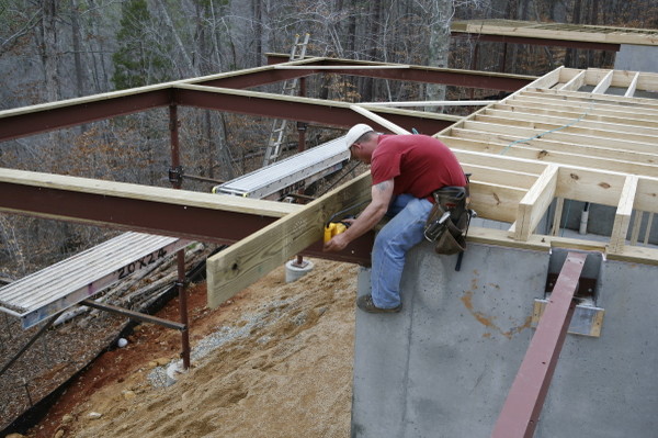 I started a new photo album in the sidebar and will add images as it goes up. There are lots of joist direction changes dictated by the structural engineer to handle the various sheer forces of the bridge structure, canopies, etc.